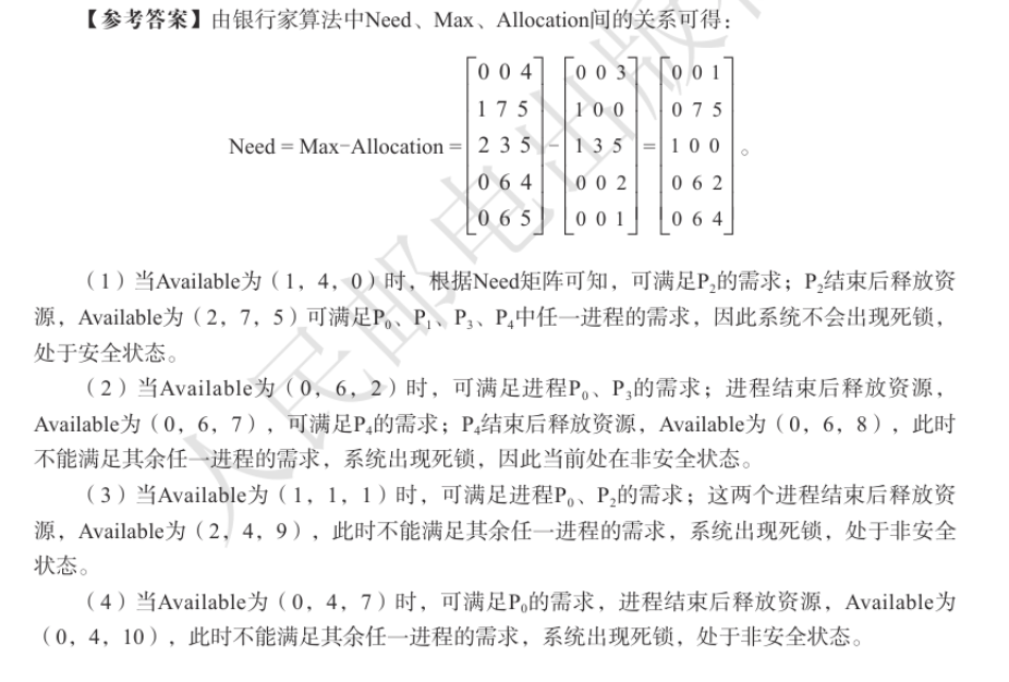 要判断系统是否安全,需通过银行家算法:先计算各进程的需求矩阵(Need = Max - Allocation),再检查是否存在一个安全序列(进程能依次完成,释放资源后满足后续进程需求)