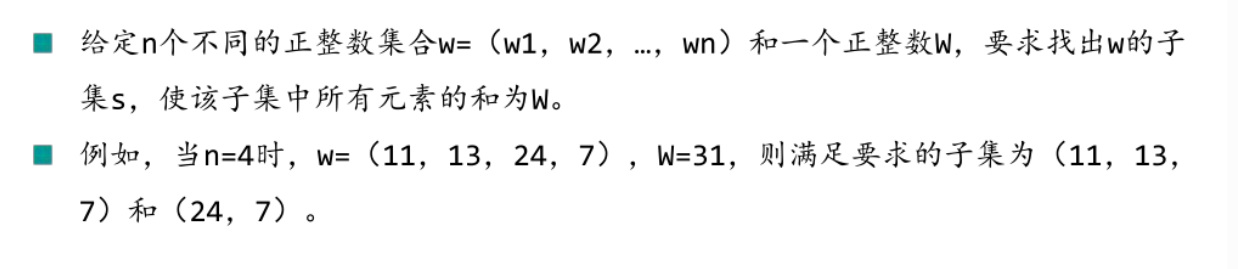 - 若当前子集和 + 剩余元素的总和 < W,直接剪枝(即使选完剩余元素也达不到W)。