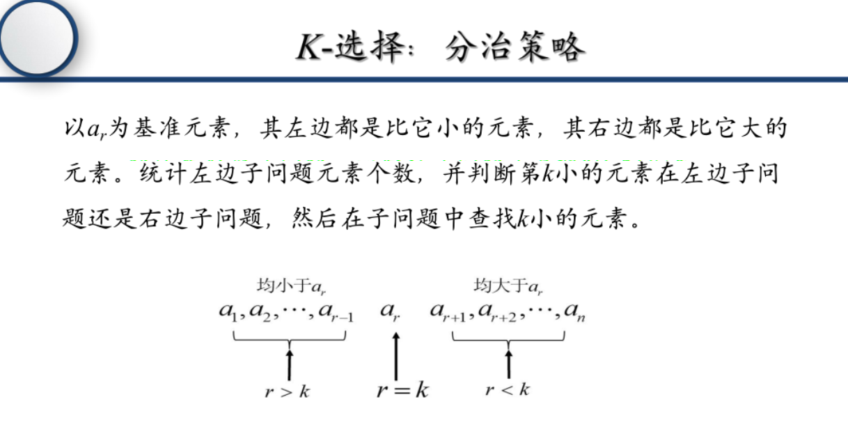 使用分治法求解k选择问题(找到第k小元素),基于快速排序的思想,通过分区操作减少搜索范围。