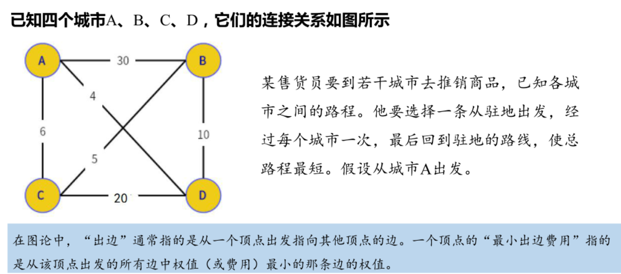 ∞表示无直接边):graph = [ [∞, 30, 6, 4], # A(0)的出边:A→B(30)、A→C(6)、A→D(4) [30, ∞, 5, 10], # B(1)的出边:B→A(30)、B→C(5)、B→D(10) [6, 5, ∞, 20], # C(2)的出边:C→A(6)、C→B(5)、C→D(20) [4, 10, 20, ∞] # D(3)的出边:D→A(4)、D→B(10)、D→C(20) ] - 目标:找路径
