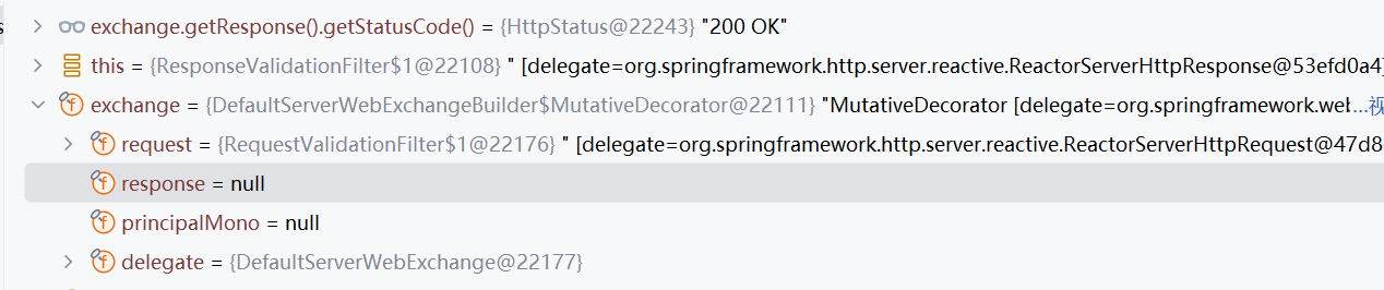 response字段在调试器中显示为null,getResponse()方法内部会通过createResponse()动态生成ServerHttpResponse实例(默认是DefaultServerHttpResponse); - 生成的